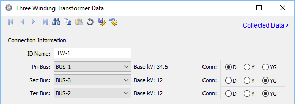 连接到变压器三次侧绕组的母线。该母线必须已经在单线图中存在。一定要注意三次侧母线应该与发电机三次侧额定电压具有近似相等的基值电压。(但是,EasyPower可以建模任何离标称kV额定值。)作为参考,二次侧母线基础kV显示在母线名称旁边。 只有三相母线可供选择。基kV显示线对线(LL)电压。 |