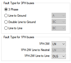在控制选项卡上的短路选项中,您可以指定三相和单相母线的每个故障类型中的默认故障相位。