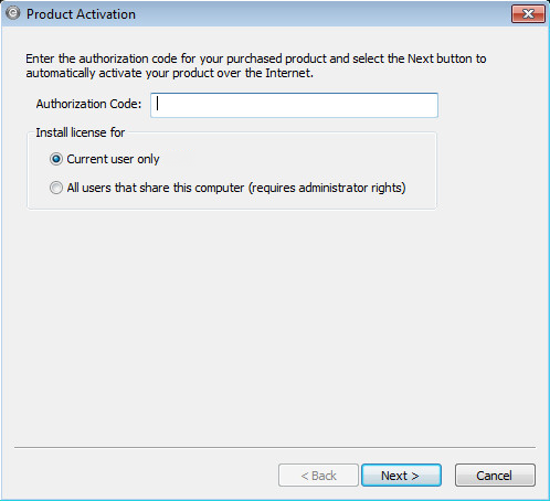 - Na janela Ativação do produto, insira o Código de autorização recebido da EasyPower LLC, selecione se a licença deve ser aplicada apenas ao usuário atual ou a todos os usuários e clique em Próximo.