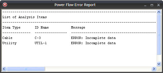 Fluxo de Potência. Se um ou mais equipamentos estiverem desconectados ou com dados incompletos, você será notificado neste instante. Equipamentos com dados incompletos estarão destacados na cor vermelha. Uma caixa de diálogo de erro aparece. Para ver os erros, clique em Sim. Um relatório de erros aparece como mostrado abaixo, listando os equipamentos com dados incompletos.