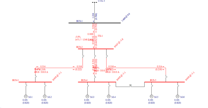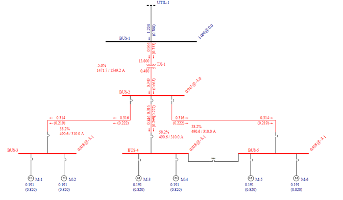 A solução do fluxo de potência é mostrada inicialmente em megawatts and megavars. Você pode mudar isto para kilowatts and kilovars, se desejado, clicando Opções de PF > Resultados no Unifilar na guia do Fluxo de Potência. A direção dos fluxos é indicada pelas setas. O fluxo de MVAR é indicado pelo valor entre parenteses ( ). Os números abaixo dos motores mostram o carregamento atual de cada motor.