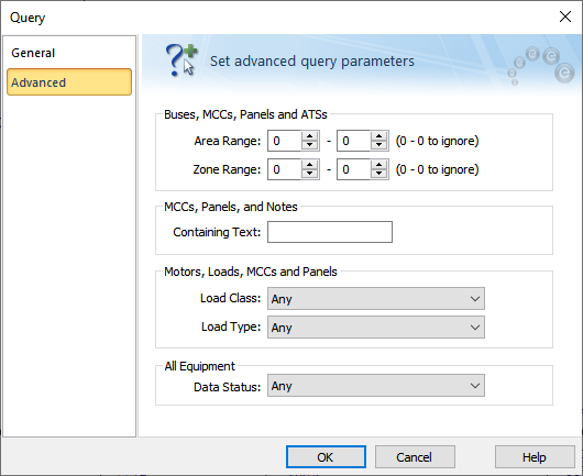 Você pode consultar por equipamentos com dados incompletos, dados estimados e dados verificados, ou qualquer status de dados de entrada. Todos os equipamentos possuem Status de Dados na guia Comentário. O programa seleciona equipamentos do unifilar que coincidem com o status dos dados. Você pode então criar códigos de cores no unifilar que coincidam com o status dos dados. |