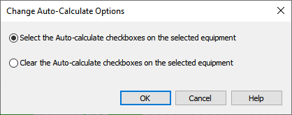 | Desmarcar as caixas de seleção Calcular automaticamente nos equipamentos selecionados | Desmarca as caixas de seleção Calcular automaticamente nos itens selecionados. Você pode então abrir as caixas de diálogo de dados individuais para definir manualmente os valores. |