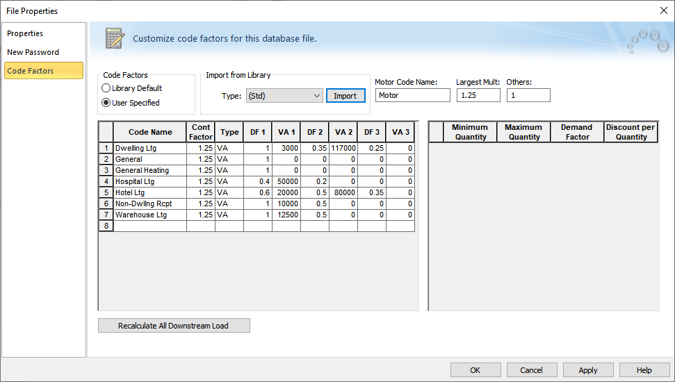 O EasyPower tem uma biblioteca especificada pelo usuário "(Std)" que pode ser usada em conjunto com as recomendações descritas no Artigo 220.40 da NFPA 70. Os fatores de código discutidos no artigo não são usados por padrão no EasyPower, mas é possível importá-los.