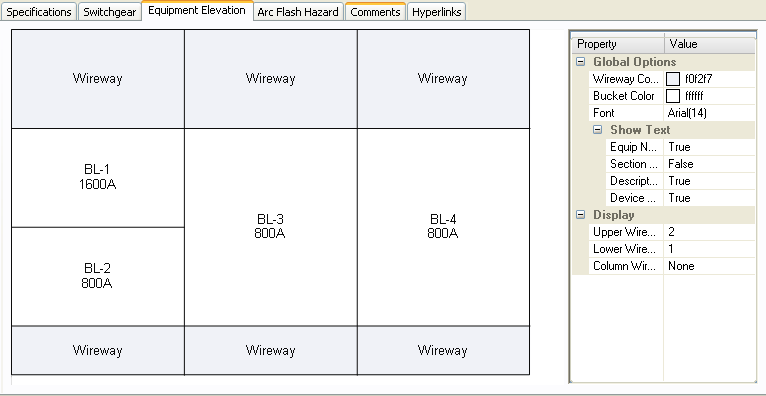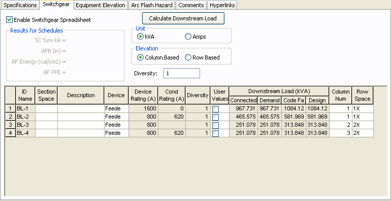 Se você definiu o tipo de barra como centro de distribuição de cargas (switchgear), você pode visualizar a elevação do centro de distribuição de cargas (switchgear). Na guia da caixa de diálogo de Dados de Barra, na guia Centro de Distribuição de Cargas, você pode especificar se o layout da elevação é baseado em colunas ou linhas. Para colunas, os disjuntores serão empilhados verticalmente em uma unidade. Para linhas, você pode ter disjuntores individuais através da linha (2X), ou disjuntores à esquerda (1X-Esquerda) ou à direita (1X-Direita).