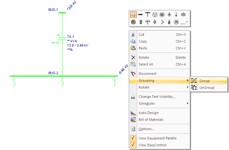 Equipamentos podem ser agrupados no unifilar de mode a representar um objeto gráfico unico. Após você agrupar os equipamentos você pode selecioná-los com um único clique para movê-los, copiá-los e colá-los de uma única vez. Para agrupar os ítens, primeiro selecione os ítens. Dê um clique com o botão direito do mouse e clique em Agrupamento > Agrupar.