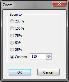 Selecione Zoom > Zoom Customizado a partir da guia Página Inicial para configurar um fator de zoom específico. Você pode ou escolher uma quantidade de zoom pre-definida ou clicar em Customizare entrar um número específico.