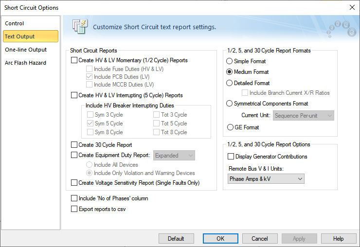 Três tipos de estilos de resultados em formato texto são disponibilizados, ANSI, Componentes Simétricas e GE. O estilo  ANSI é projetado para reportar todas comparações significantes de multiplicadores da norma de disjuntores ANSI e os requisitos das normas de relés de proteção. Se você seleciona o estilo de resultados ANSI, três formatos diferentes são disponibilizados. Níves de 1-3 promovem o formato padrão projetado para comparação da suportabilidade de equipamentos e correntes para proteção. O nível 3 contém as informações mais detalhadas.
