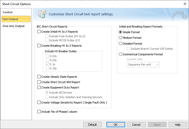 Existem quatro formatos diferentes de relatório disponíveis para o relatório de interrupção e inicial: Simples, Médio, Detalhado, e Componentes de Sequência. Cada opção provê diferentes níveis de detalhe. Experimente as diversas opções para determinar qual delas melhor se adequa às suas necessidades. Para o relatório Detalhado, você pode optar por Incluir as Relações X/R das Correntes dos Ramos. Para o formato Componentes simétricos, você pode selecionar entre Sequência por unidade, Ampères de fase ou Por unidade de fase para a unidade de corrente. |