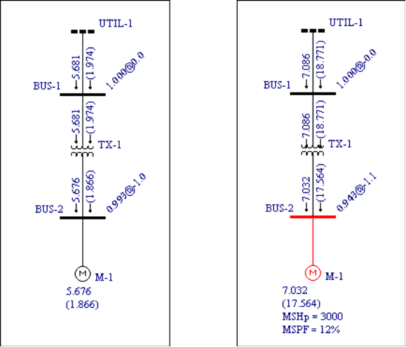 Por exemplo, considere um motor onde existe uma carga motriz total de 7000 HP com fator de escala 100 percento. O caso base de fluxo de potência indica uma tensão de 0.993 pu com 5.676 MW e 1.866 MVAr fluindo para o motor de 7000 HP. Isto também pode ser mostrado como sendo 5.975 MVA com fator de potência de 0.95 alterando-se a forma de exibição dos resultados no unifilar.