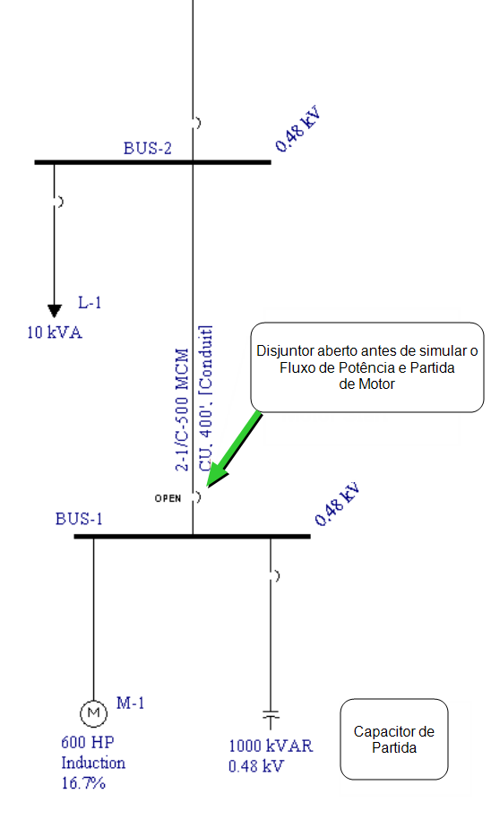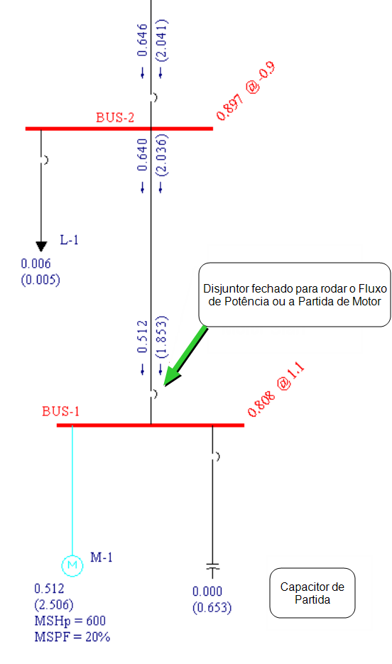 Para simular a partida do motor com capacitores de partida, é necessário inserir disjuntores ou chaves no circuito a montante do motor e do capacitor de partida. Veja figura abaixo. Antes de rodar o fluxo de potencia e simular a partida do motor, abrir o disjuntor. Isto permite um calculo de fluxo de potência preliminar sem o motor e com o capacitor conectado. Rode o fluxo de potência e simule a partida do motor. A seguir feche o disjuntor que conecta o motor e capacitor de partida. Agora você chegou na solução. Para ver a simulação da partida do motor sem o capacitor de partida, abra o disjuntor do capacitor.