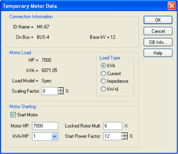 Os HP de partida do motor são uma carga adicional ao modelo de carga existente. A opçãode Partir o Motor irá adicionar um HP definido pelo usuário (corrente de rotor bloqueado real) para a carga, mass somente para o caso de partida de motor. A carga de partida do motor não afeta a carga do fluxo de potência.