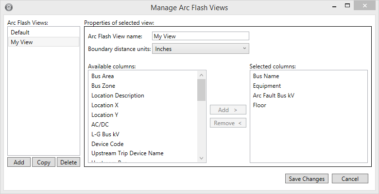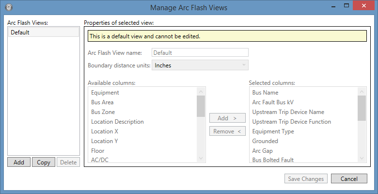 O Relatório dos Cenários de Arco Elétrico inclui uma visualização Default. Nesta visualização, a unidade da distância limite para o arco elétrico são configuradas em polegadas e uma seleção pré-determinada das colunas disponíveis são visualizadas.