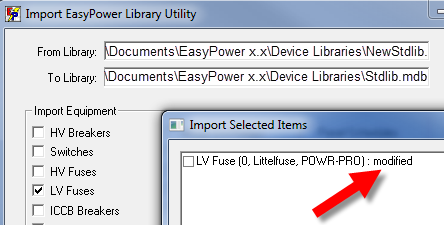 Importante: Para quaisquer componentes que são listados como modificado, o conteúdo na biblioteca fonte substitui o conteúdo da biblioteca destino. Certifique-se de que você quer substituir o conteúdo na biblioteca destino antes de continuar. Se necessário, você pode abrir cada uma das bibliotecas no EasyPower para confirmar as diferenças antes de importar.
