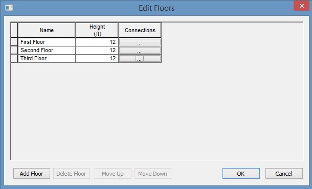 Para adicionar um andar, no menu Ferramentas, selecione a seta embaixo de Instalações, depois Andares e clique em Adicionar andar. Digite o nome do andar e a distância (em pés) entre o piso e o teto na coluna Altura(pé).