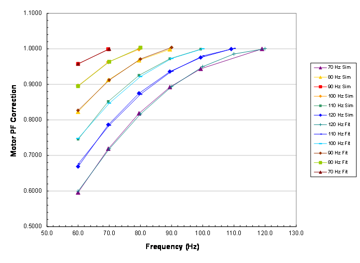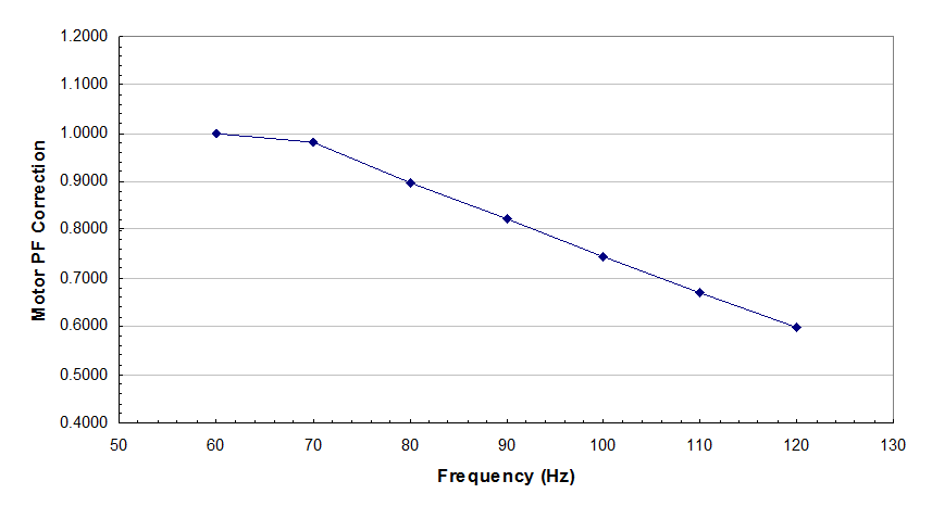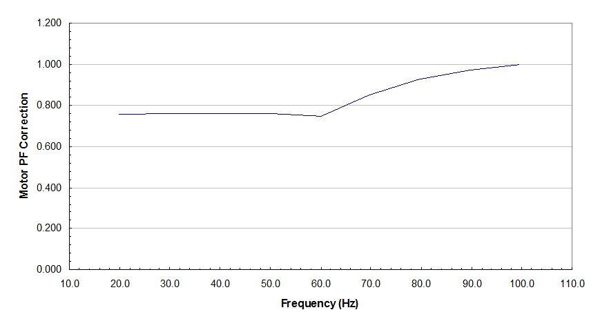 A melhor maneira de ler a plotagem acima é olhar uma curva em relação a uma aplicação de um dado AFD de um motor. Se nós temos um AFD e é necessário operar esse motor, digamos a uma frequência máxima de 100 Hz, então nós devemos primeiro escolher a configuração de curva que tem o maior valor de correção de 1.0 em 100 Hz. Se o motor especificado para esta aplicação tem velocidade nominal de 100 Hz (i.e. na velocidade real de 1800 RPM para 60 Hz e a velocidade máxima de 3000 RPM a 100 Hz) então se o motor estivesse rodando a 60 Hz, seu fator de potência poderia ser de aproximadamente 0.75 vezes o seu fator de potência nominal. Se o mesmo estivesse rodando a 80 Hz, o fator de potência seria de aproximadamente 0.92 vezes o fator de potência nominal do motor.