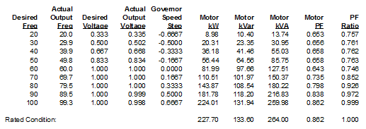 Para a simulação de Fluxo de Potência em AFD, o motor na saída do AFD irá responder com seu carregamento dependente de sua tensão e frequência. A modelagem usada no EasyPower é aproximada com base em uma resposta típica de motor de 100 HP a esses fatores, com a carga do motor no eixo modelada como velocidade quadrática.