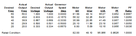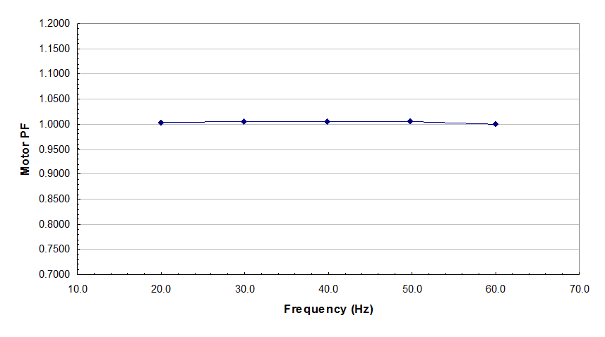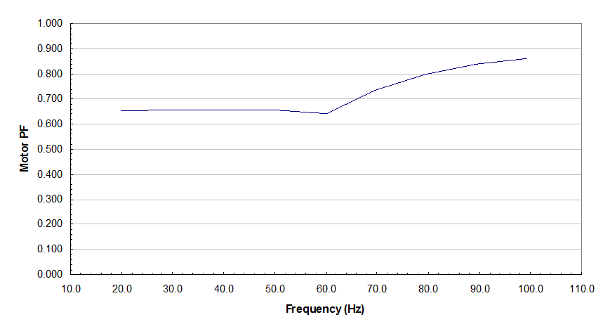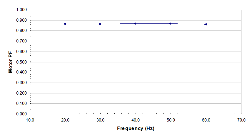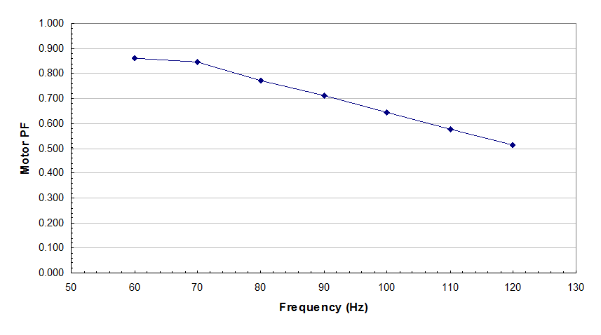 A partir das tabelas abaixo, pode-se ver um comportamento interessante. Por causa que esta se mantendo constante a relaçao Volts/Hz, quando abaixo da frequência do sistema, o fator de potência do motor é praticamente constante. Acima da frequência do sistema, o fator de potência aumenta. Isto acontece porque um motor especificado para operar acima da frequência do sistema esta na realidade operando a frequências menores do que a de placa do motor especificado. Assim, existe uma queda no fator de potência do motor.