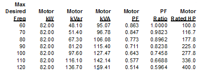 E também, as tabelas e plotagens acima mostrar uma clara relação entre o fator de potência do motor e a frequência de saída do AFD. Esses resultados são usados para gerar relações gerais que aplicam correções ao motor pf no EasyPower quando um motor em uma saída de AFD tem uma frequência especificada diferente da frequência base do sistema. Além disso, considere a próxima tabela onde nós mostramos motores especificados para o aumento da frequência máxima de operação. Vê-se que aumentando-se os HP nominais mais elevados são necessários para satisfazer os requisitos de potência maiores para as frequências de saidas mais altas do AFD. Esses resultados assumem: