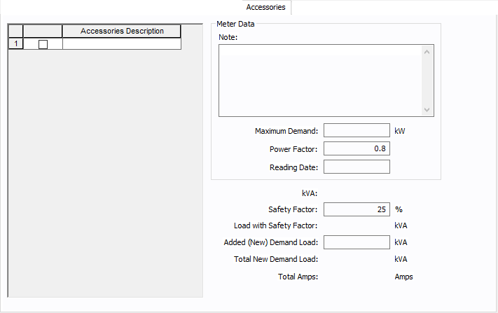 Os acessórios para os tipos de equipamentos de distribuição podem ser especificados na caixa de diálogos de quadros, CCM ou barra. Você adiciona ou deletar ítens acessórios conforme necessidade de cada equipamento. Somente os ítens selecionados são mostrados nas saídas de lista de cargas.