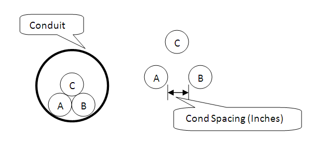 Distância entre a isolação externa ou da jaqueta aos condutores de fase adjacentes. Isto afeta os cálculos da reatância do cabo. Todos os três espaçamentos são modelados da mesma forma ou como uma DMG (GMD) equivalente. Nota: Esta não é uma distância centro a centro. Veja figura abaixo.