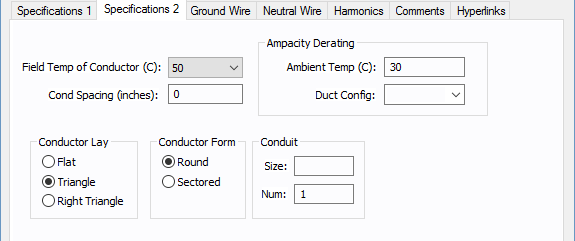 Tamanho e número de eletrodutos. Isto não afeta a impedância ou o cálculo da ampacidade, mas é armazenado a título de informação. O SmartDesign™ preenche estes campos automaticamente ao dimensionar os cabos. O tamanho aparece em polegadas ou milímetros dependendo de como as Unidades são especificadas na guia Especificações 1. |