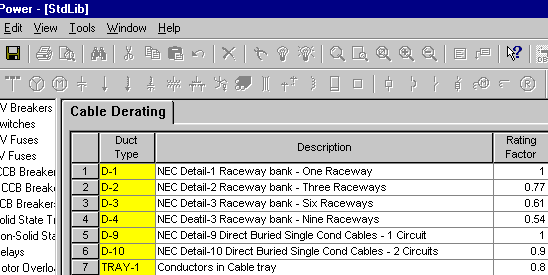 Este campo permite a redução da ampacidade do cabo baseado no número de condutores no eletroduto, bandeja ou duto. A seleção entre D-1, D-2, e assim por diante, que corresponde ao Detalhe 1 NEC, Detalhe 2 NEC, e assim por diante, do Código Elétrico Nacional (NEC). Se este campo é deixado em branco, um multiplicador 1 é assumido para os cálculos da ampacidade. Os fatores aplicados estão armazenados na biblioteca de dispositivos e podem ser customizados, se necessário. Se você precisar aplicar os fatores de redução nos cabos baseado no número de condutores no eletoduto ou bandeja, você poderá incluí-los na bibioteca.