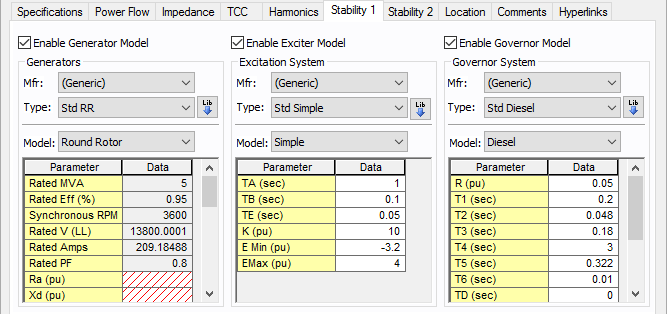 Para detalhes nesses parâmetros, veja Estabilidade Dinâmica. Para informações sobre a biblioteca, veja Biblioteca de dispositivos do EasyPower.
