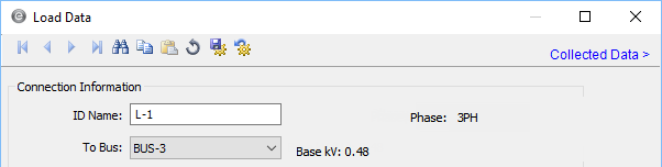 Este é o nome de identificação da barra na qual o equipamento está conectado. A tensão base da barra está indicada à direita. A tensão de base exibe a tensão mais alta entre os condutores de condução de corrente. Para equipamento monofásico conectado fase-fase ou trifásico, a tensão de base é a tensão fase-fase (LL). Para equipamentos monofásicos conectados fase-neutro (LN), tensão de base é a tensão fase-neutro. |
