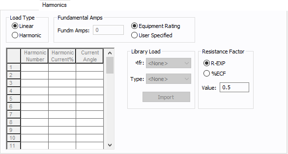 O default é Linear, indicando que o equipamento não produz harmônicos. Escolhendo Harmônico torna o equipamento uma fonte harmônica e outros campos nesta guia passam a ser editáveis. Nota: Para acionamentos de frequência ajustável (AFD), o Tipo de Carga é sempre Harmônico. |