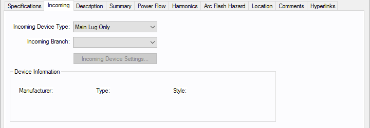 Você pode escolher o equipamento do ramo de entrada tal como cabos tranformadores ou barramentos blindados. Todos os ramos conectados ao painel no unifilar são exibidos na lista. |