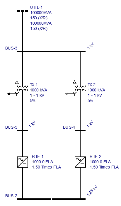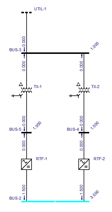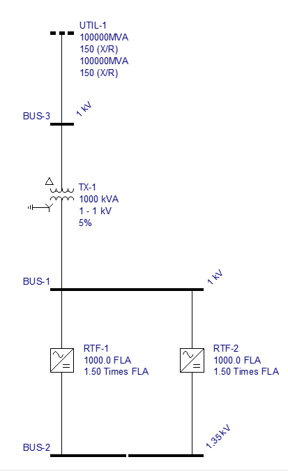 Se retificadores paralelos não são conectados a uma mesma barra e eles tem dois caminhos paralelos independentes que suprem uma condição de falta que é a soma, a contribuição total de falta é o total das duas fontes como definido pelos seus múltiplos da corrente nominal (xFLA). Isto é uma aproximação adequada para todos os tipos de retificadores.