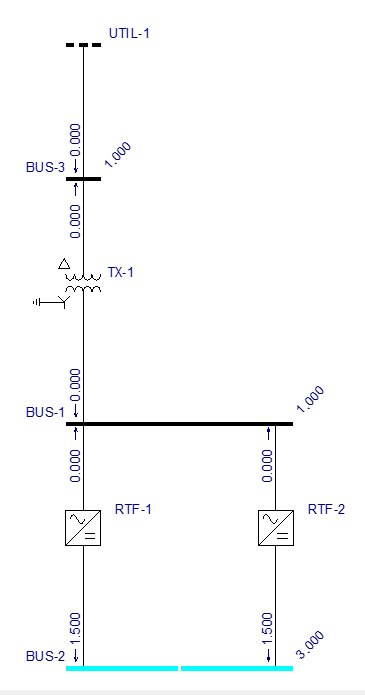 Entretanto, se você tem dois Diodos ou Tiristores Retificadores em paralelo e eles tem o mesmo transformador a montante, então o curto-circuito total do lado CC não será representado corretamente quando seus múltiplos da corrente nominal (xFLA) representam dois retificadores independentes. A corrente de curto-circuito do lado da barra CC irá ser aproximadamente o dobro do que é realmente, se os retificadores são do mesmo tamanho. A resistência dos conversores em paralelo desempenha um papel muito pequeno, que é controlado preponderantemente pelo transformador único a montante.