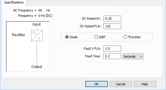 Especifica o componente para o retificador. Escolha entre Diodo, Tiristor ou IGBT. Isto afeta os métodos de simulação do fluxo de potência. Os tipos Diodo e Tiristor utilizam as equações de Kimbark para determinar a potência ativa e reativa na entrada do Retificador e para controlar a tensão e a corrente CC. O tipo IGBT controla o fator de potência e a tensão. Os campos de controle são especificados na guia Fluxo de Potência.