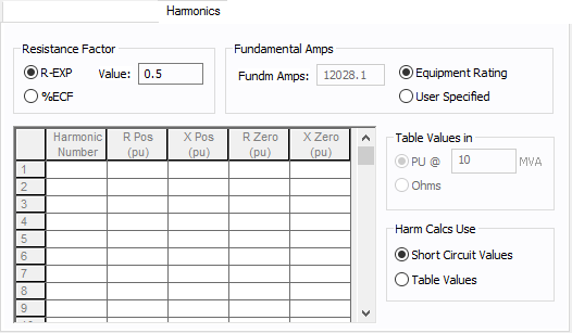 Se as Tabelas de Valores são escolhidas para Usar no Cálculo das Harm, então a tabela fica acessível. Para cada ordem harmônica você pode introduzir as impedâncias: R Pos, X Pos, R Zero e X Zero. Para cada ordem harmônica introduzida na planilha, a linha deve estar completa com os dados. A ordem harmônica pode ser inteira ou não-interia.