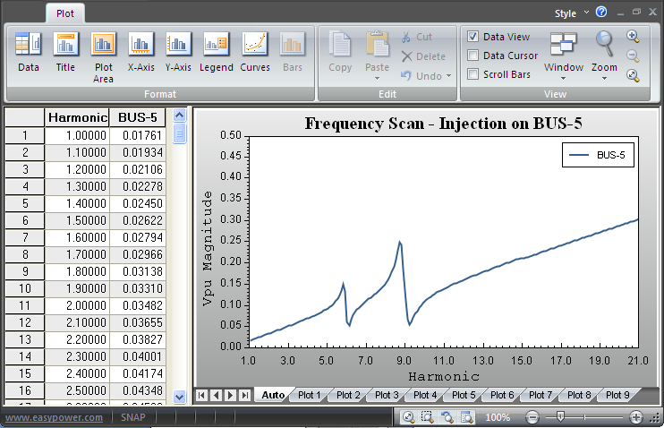 Para se obter um "scan" de frequência em uma barra pela injeção de corrente na mesma barra, dê duplo-clique na barra quando estiver no módulo de harmônicos. Isto irá apresentar uma janela com a plotagem e uma planilha como mostrado abaixo. Para se obter um "scan" de frequência na barra pela injeção de corrente em outra barra, você precisa definar essas plotagens. O "scan" da barra onde a corrente é injetada aparece na guia Plotagem Automática.
