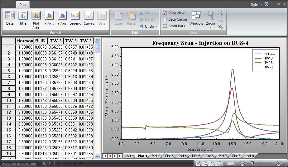 A ferramenta de plotagem do módulo Harmônicos permite você escolher até dez plotagens com até cinco barras ou ítens em cada uma. Para barras, a tensão pu é plotada; e para ramos a corrente pu é plotada.