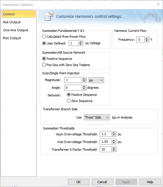 Opções Harmônicas. Você pode configurar as opções de controle principais, bem como as opções para o texto, o unifilar e a plotagem.