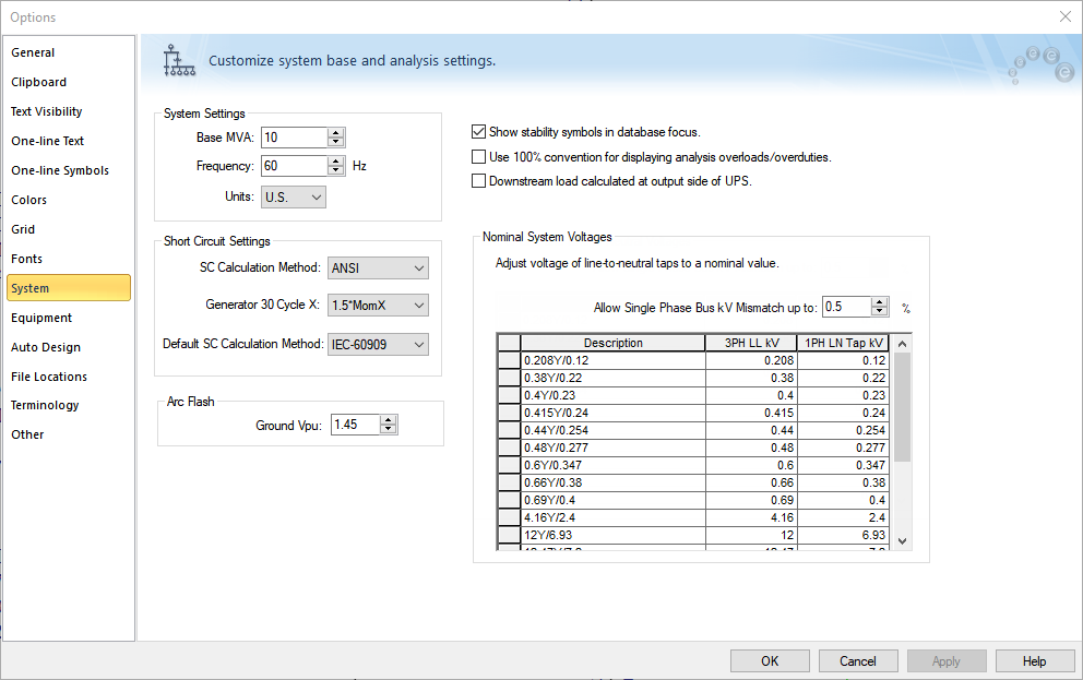 Para os equipamentos que estão sendo avaliados, faltas à terra são aplicadas na Fase "A". A tensão pu (Vpu) é calculada nas fases B e C do equipamento. A média das duas tensões Vpu’s é comparada com o valor limite que é especificado em Ferramentas > Opções > Sistema. Este valor é chamado de Vpu à Terra do Arco Elétrico. Isto tem um valor de 1.45, mas você pode modificar, se necessário.