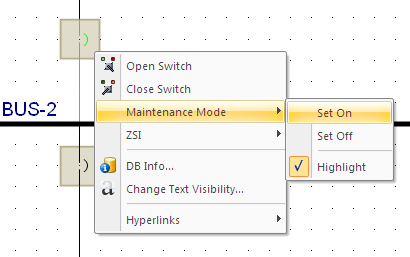 Estando no módulo de Seletividade ou no módulo de Curto-Circuito você pode tornar a configuraçao do Modo Manutenção Ligado ou Desligado utilizando o botão direito do mouse e o menu de contexto como mostrado na figura abaixo. Isto afeta os disjuntores selecioandos. Você também pode destacar os disjuntores que possuem o modo de manutenção configurado para Ligado.