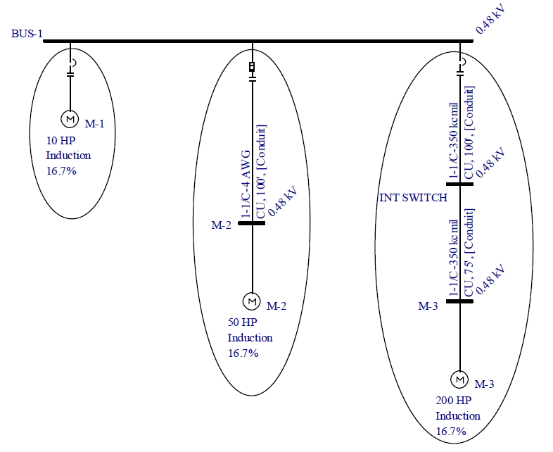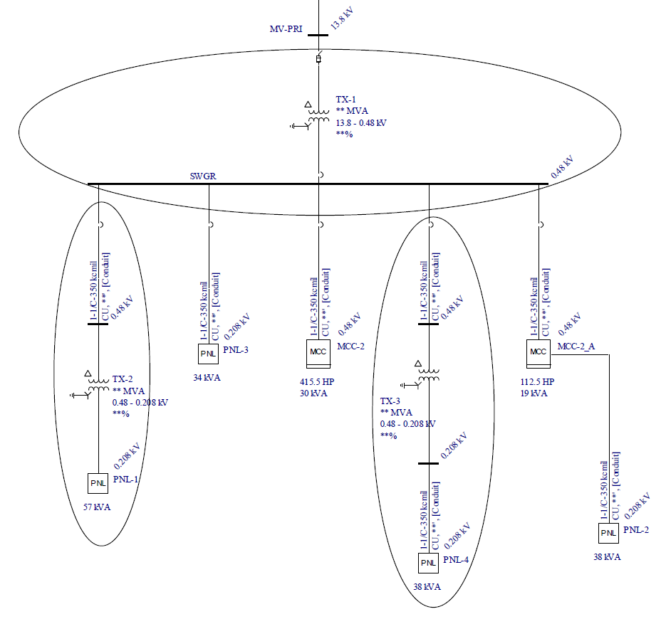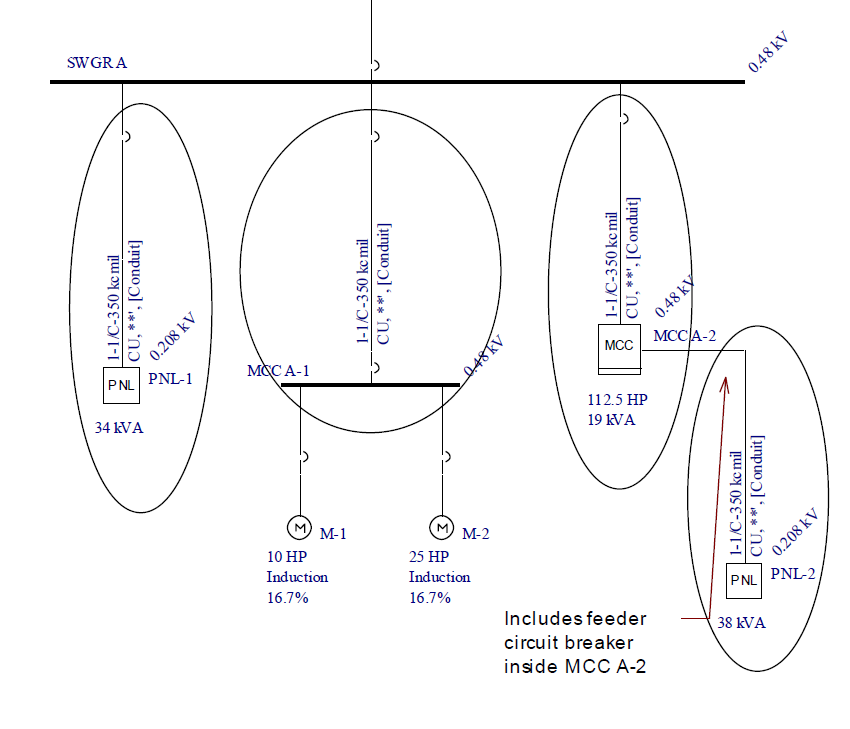 Circuito Alimentador: Um circuito alimentador é caminho entre um ponto de distribuição (barra) e uma carga ou entre dois pontos de distribuição (duas barras), e inclui dispositivos de proteção, cabos e barra a justante. Veja a figura abaixo para exemplos. Cada circuito de motor é identificado com uma oval. Circuitos definidos dentro de um Quadro ou CCM com carga do tipo Carga (não-motriz), são circuitos alimentadores.