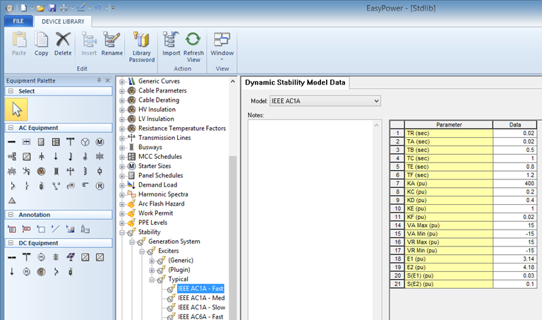 A biblioteca padrão contém dados de estabilidade para vários equipamentos tais como geradores, excitatrizes, reguladores de velocidade, "stabilizers", etc. A biblioteca vem como dados "Genéricos" e "Típicos." Você pode adicionar nos dados para os Típicos.