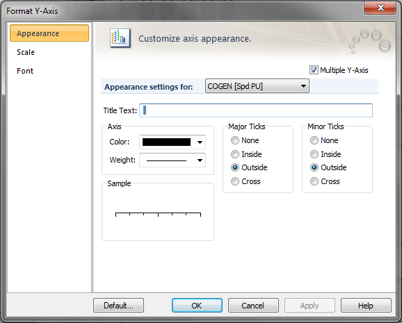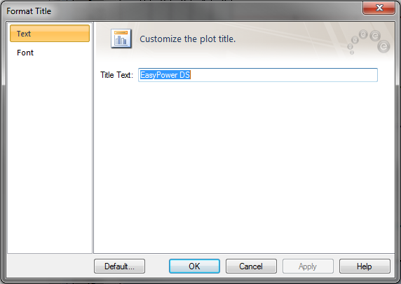 Asalterações de formatação podem ser armazenadas como default de modo que as novas plotagens sejam criadas automaticamente usando as formatações default salvas. Na caixa de diálogo de formatação individual, faça as suas alterações e clique em Default para configurar os novos valores default.