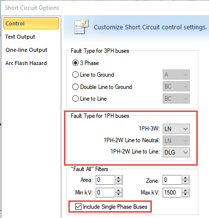 As opções de tipo de falha no menu Curto-circuito são apenas para barras trifásicas. Para tipos de falha de barra monofásica, o programa segue as opções em Opções de curto-circuito na guia Controle, conforme descrito em Suportabilidade de equipamentos para dispositivos monofásicos.