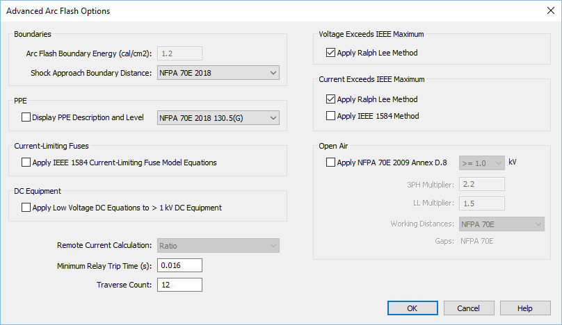 - Para a norma de arco elétrico IEEE 1584-2002, essa configuração usa por padrão o método de Ralph Lee. Pode ser alterada para IEEE 1584 ou desmarcada para omitir os cálculos.