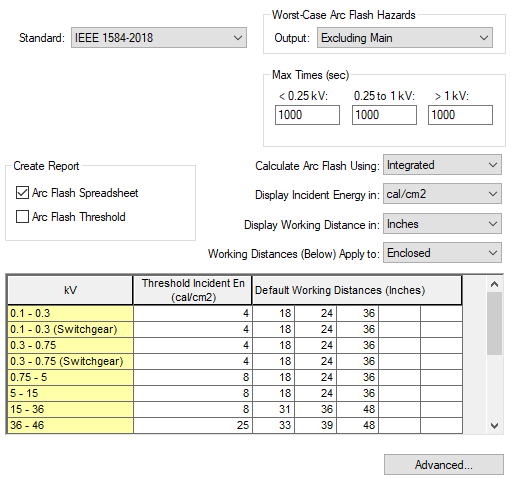 Na caixa de diálogo Opções avançadas de arco elétrico, há uma série de alterações relacionadas às atualizações da norma IEEE 1584-2018. A caixa de diálogo foi reconfigurada para exibir melhor as opções disponíveis.
