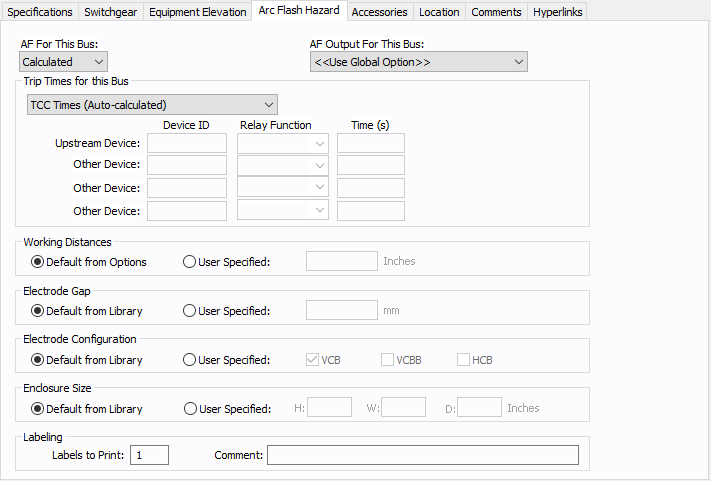 Se a distância de trabalho do equipamento for especificada pelo usuário, o relatório exibe o valor especificado pelo usuário. Caso contrário, ele mostra o valor conforme recuperado da primeira coluna da tabela em Opções de curto-circuito > Risco de arco elétrico, com base na tensão e tipo do equipamento. Observe que existem duas tabelas: uma para ar aberto e outra para fechado. As unidades se baseiam na configuração em Opções > Sistema. |