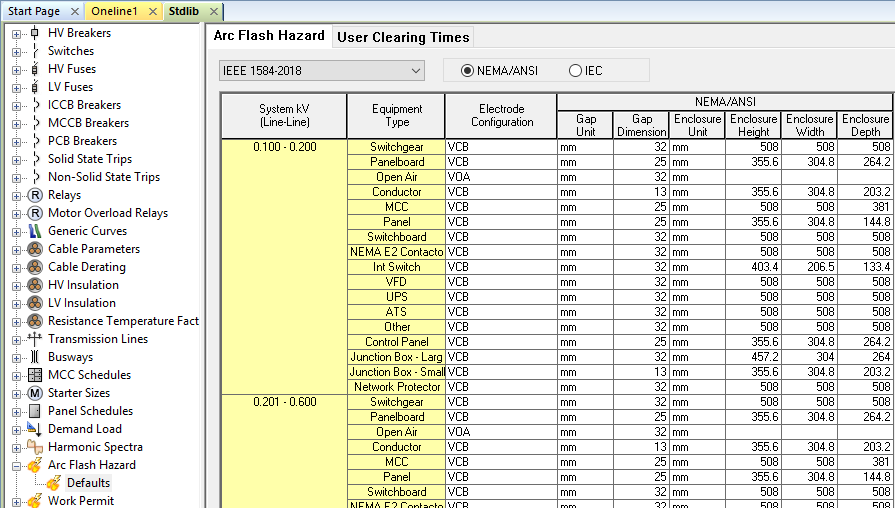 A biblioteca de dispositivos foi atualizada para fazer referência à nova norma IEEE 1584-2018. Agora existem tabelas separadas para NEMA/ANSI e IEC, em vez de colunas separadas na mesma tabela. Agora há tabelas separadas para IEEE 1584-2018, IEEE 1584-2002 e V7.0 Melhorada.