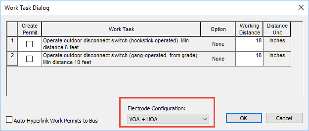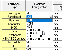 Você pode especificar a configuração do eletrodo nos vários equipamentos nos quais o risco de arco elétrico pode ser calculado. Veja Atualizações da guia Risco de arco elétrico.