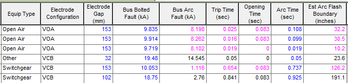 Para os cálculos da nova IEEE 1584-2018, os resultados de arco elétrico no relatório de risco de arco elétrico que são derivados usando a corrente de arco reduzida são exibidos em texto rosa, semelhante a como a corrente de arco de pior cenário era exibida no relatório no passado.
